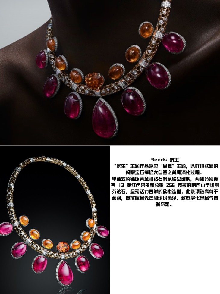单链项链,黄金钻石镂空结构,红碧玺与芬达石,颈间绽放演化之美。