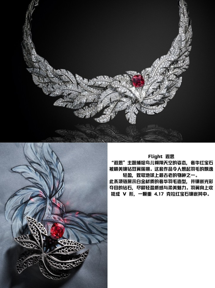 奢华红宝石,镶钻双翼,白金羽毛造型,V形收拢,4.17克拉红宝石镶嵌。