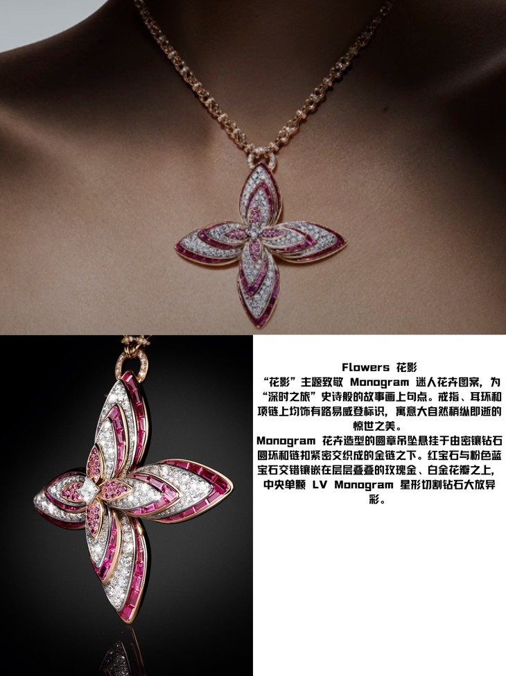 Monogram花卉图案,戒指、耳环、项链,密镶钻石,红宝石与粉色蓝宝石交错,中央LV Monogram星形切割钻石。