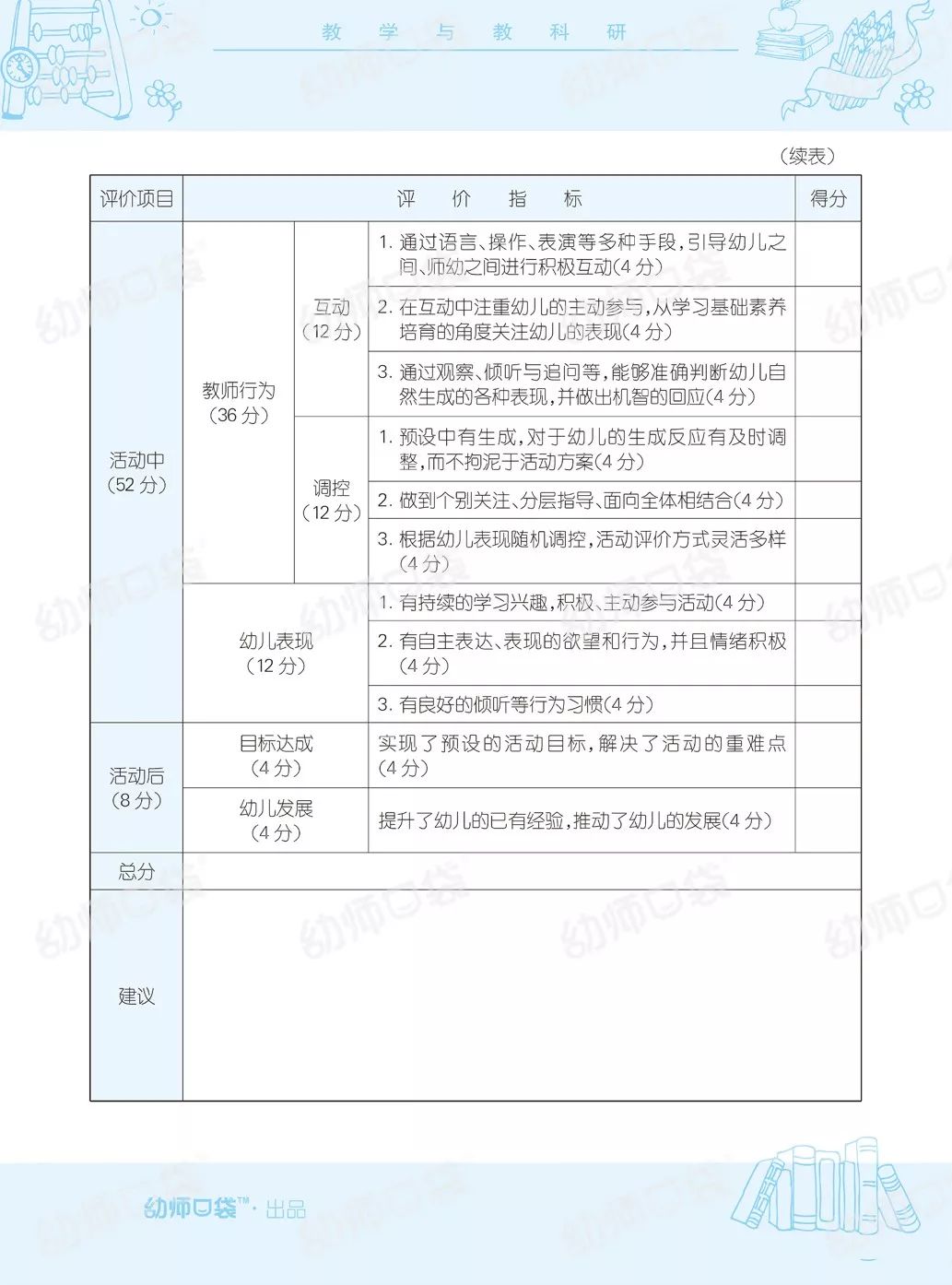 一张细致入微的评价表,对集体活动的目标制定、内容选择、材料准备、环节设计,帮老师看到自己的进步和不足。
