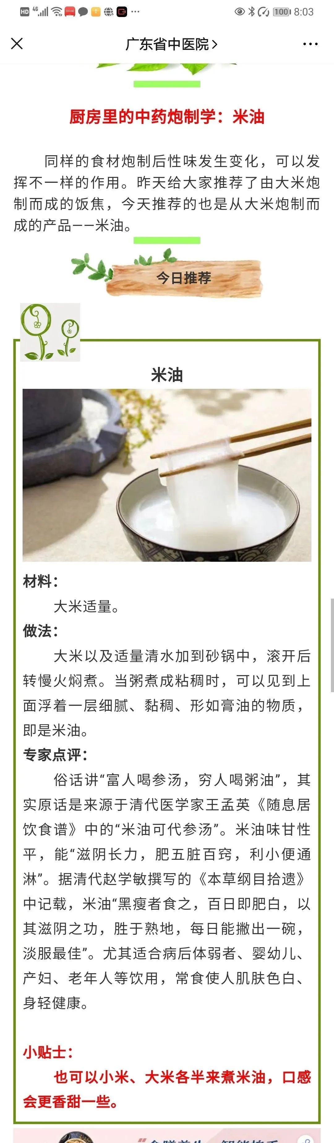 没错,为您推荐的就是米油。而这个米油以什么材料熬出来的最佳的。文中说,用大米和小米,就是我们常说的二米粥来做最好。