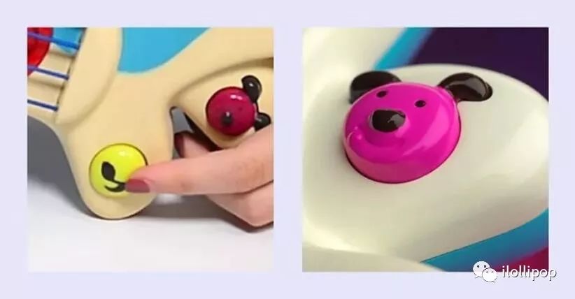 4根真的可以弹奏出和弦声音的吉他弦,拨动它会发出随机的琴弦声音。在播放歌曲时拨动,可以改变乐曲的节奏,培养宝宝节奏感。