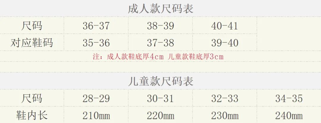 尺码表附上,成年人可从36穿到41,儿童码数从28穿到35~
