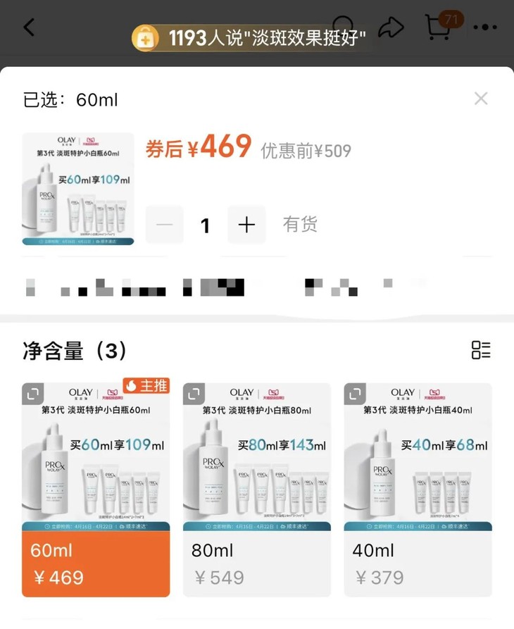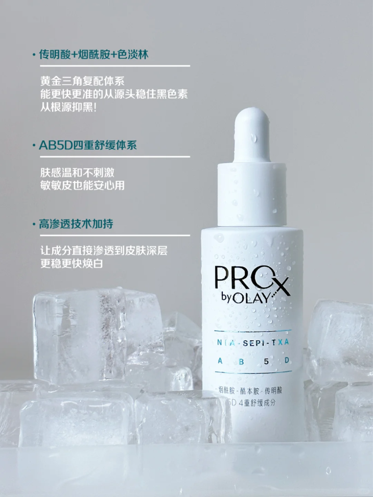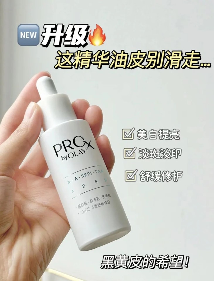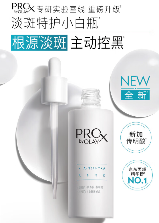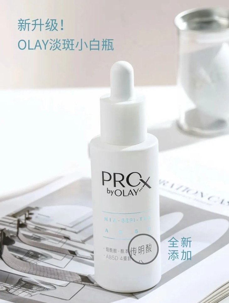 成分党都知道想要美*白,烟酰胺浓度是非常重要的,而小白瓶里面烟酰胺的浓度就壕气的加到了5%。而且相较于1代、2代,这款Prox三代小白瓶更是在配方上做了升级。首次添加了以前用于临床治疗“黄褐斑”的 传明酸 成分。配合上OLAY专研高纯度烟酰胺和SDL色淡林专利淡斑配方,更快更强稳住黑色素母体。此外,产品还添加了 稳定型VC成分AA2G ,K氧抑黑,提亮肤色不反黑;同时搭配AB5D四重舒缓成分,以更强的舒缓功效稳定肌肤屏障。透明蛋清质地,流动性很好,涂在脸上嗖的就能被皮肤吸收。设计也很简洁大方,白色+银色的搭配,给人一种干干净净的高级感。挤压式的滴管设计 很好取量,只需要挤一次吸头,就满满一泵了。总结来说就 是美*白效果更强大了,使用感更温和了 ,容易敏感又想要美*白的姐妹,不妨考虑试试看这款。今天,我们这里下单OLAY第三代淡斑小白瓶精华, 闪购价只要119元 , 两瓶更划算,只要199元! !!只不过库存不多,全靠抢!这个奶奶辈儿的老品牌,可以说是小时候妈妈梳妆台上的C位护肤品了。那句经典广告词,我妈现在还记得“肌肤与你,越变越美”。并且,它作为护肤界的常青树宝洁旗下的护肤品牌,和SK2为同门师兄弟,产品本身的水平就很强。2018年双十一美妆全网排名,力压欧*雅、雅诗*黛等大牌,排在了前头。