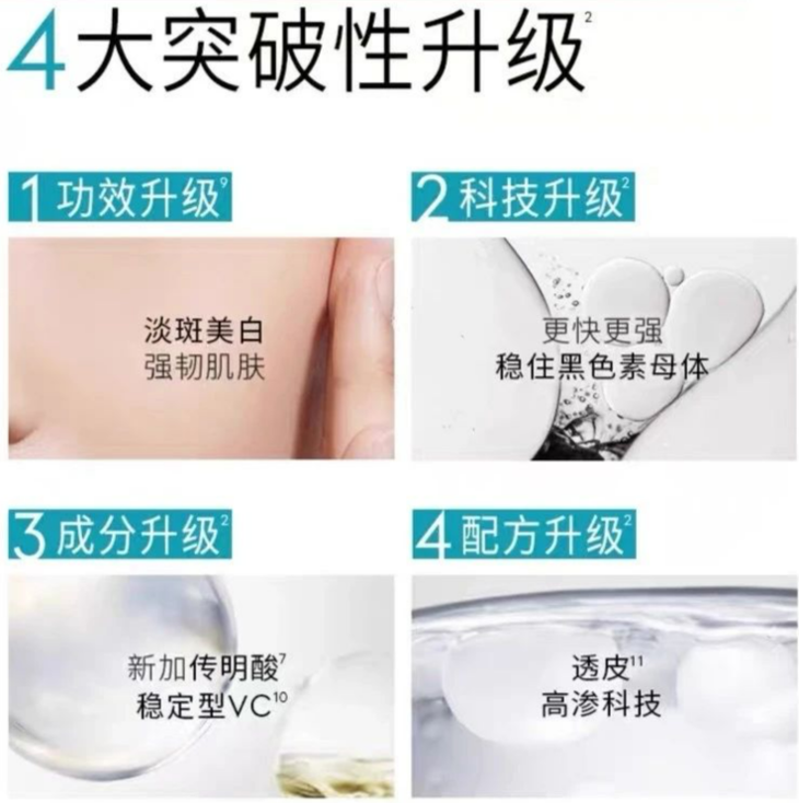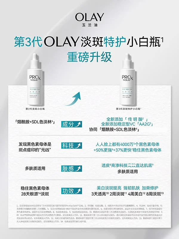 成分党都知道, “烟酰胺” 能抑制并还原!已生成!的黑色素。SK2小灯泡,就是通过“烟酰胺”来达到美*白淡斑作用的~在文献搜索平台以【烟酰胺】和P&G为关键词竟可以搜到近30篇学术文章三代小白瓶中就添加了王牌成分—— 高浓度(5% )的烟酰胺 。而5%的烟酰胺,改善肤色的效果相对也更好,甚至还能淡化细纹,让小脸儿Q弹嫩滑。其次, 色淡林( SDL ) 这个成分也很值得一夸~它能直接从源头「封印」黑色素母体,从根本上稳住黑色素细胞。受试者在每天使用含有 1% SDL 色淡林的保湿霜,每次 0.5 g,早晚各一次的情况下,跟未使用的受试者对比,色斑情况得到了显著的改善[1]。该报告是在对照试验下,针对 1% SDL功效的临床试验报告如果你以为,色淡林只能淡化已有色斑、痘印,那你可就太小看它了!它还能「抑制」黑色素母体树再次生长, 预防斑点、痘印形成 。哪怕有它拦不住的黑色素,想往脸上跑,还得再看人家5%的烟酰胺同意不同意。这样一面从源头淡化已有沉积的黑色 素,一面预防,蕞后再加一道关卡严防死守。OLAY不愧是市面上极少数能把这个黑马成分玩明白了的品牌。这已经够优秀了,但三代小白瓶为了增强这方面的能力,额外 添加了一个用于临床治疗“黄褐斑”的传明酸成分 。重要的是,小白瓶还拿到了难度很高的美*白祛斑特殊用途化妆品认证。还有一点我要夸哦,升级版的三代小白瓶,在 K 敏方面也有提升 。除了保持原有的抗敏体系外(尿囊素、泛醇、甘草酸二钾),还添加了红没药醇。它的加入大大减少了美*白产品的刺激性,和泛红的风险~无论是干皮还是油皮都可以用, 即使是初次用也不用担心~而且成分种还含有甘油、丁二醇、海带糖提取物,能给你补水保湿。一边美*白淡斑,一边舒缓保湿,难怪用完皮肤不仅不那么暗沉发黑了,还更细腻、更有光泽感。就算白天的可见光、紫外线和空气都不会影响它的稳定性和活性。一推开就有种渗入进皮肤的感觉,肤感很好,油皮用着也不会觉得有负担。不过我建议普通肤质的姐妹,刚开始用的时候先从半滴管适应,逐渐过渡到一滴管。淡斑这件事,贵在坚持!!坚持下去方能看到惊喜变化,皮肤重回年轻状态~更何况这次力度特别大,想变白变漂亮的姐妹,抓紧时机哦!!!