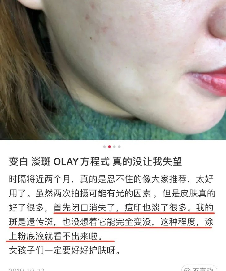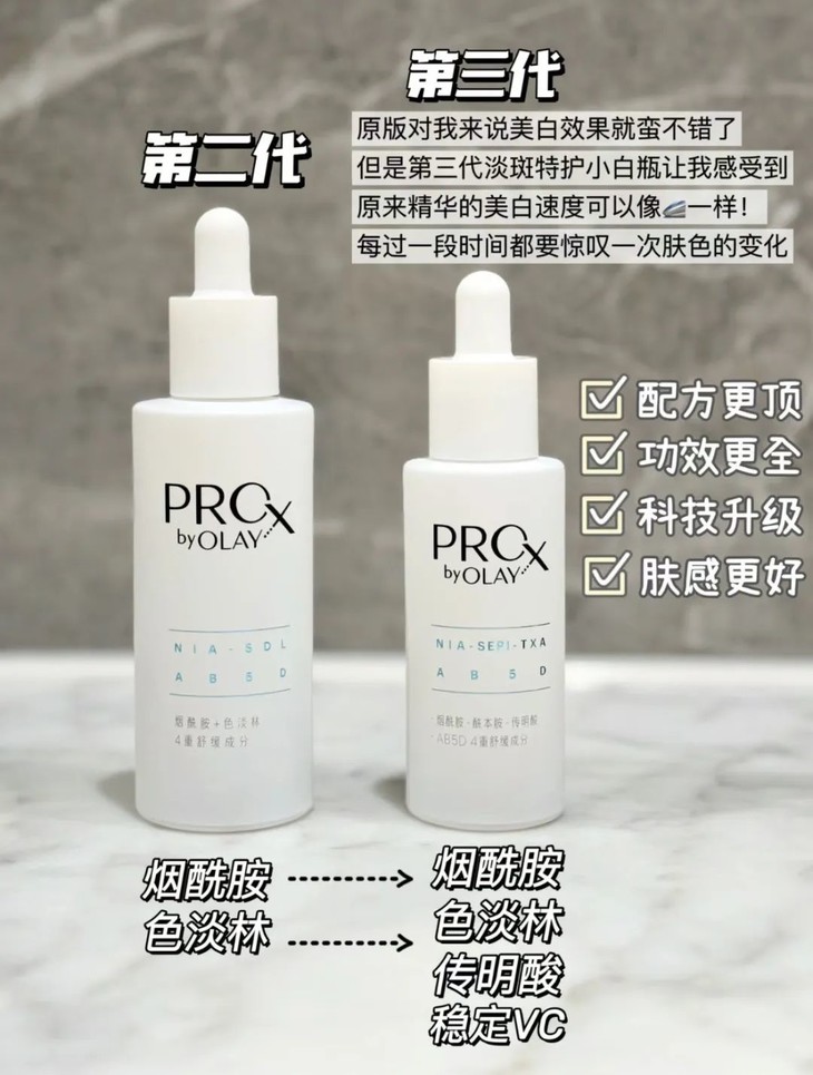 懂护肤的姐妹应该都晓得,它和SK2小灯泡师出同门,都属于宝洁集团(P&G),技术都是共享的。而且火了近10年,口碑一直都很好,是很多明星、博主离不开的美*白精华。OLAY淡斑小白瓶,我真的很有发言权,我从第一代就开始用了,到现在的第三代已经空瓶无数了~不夸张的说,早晚坚持不到两个月时间,斑是有淡化的, 虽说不是一下子干净的那种效果,但的确有淡一点 。
