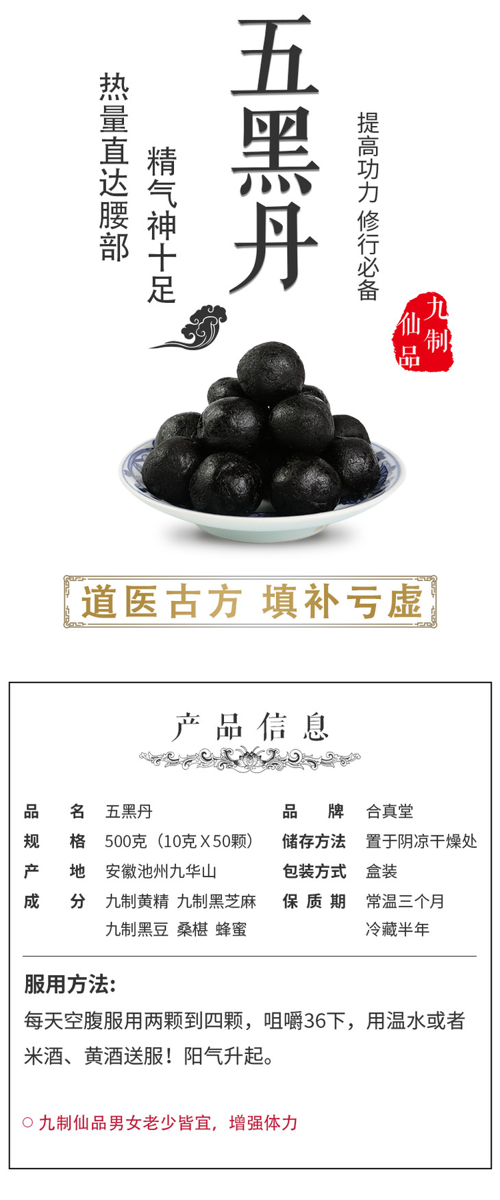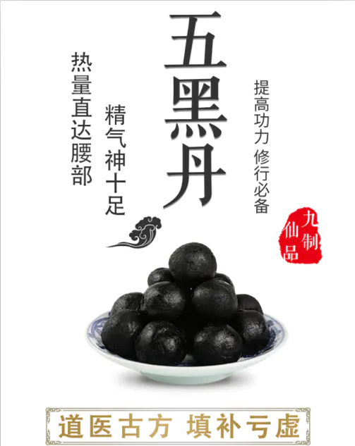 五黑丹,终南山道医补肾秘方,把黄精、黑芝麻、黑豆、桑葚、新会陈皮,茯苓等天然无污染食材,经过九蒸九晒特制而成。看似简单的几种食材,通过古法炮制和专业配比,直接入肾,滋补肾精。效果非常好!