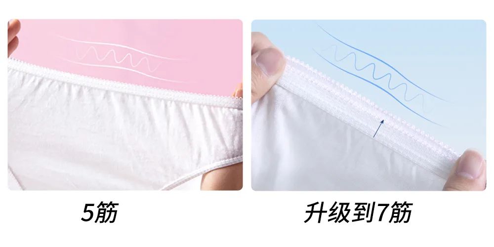 细节上也做了升级,腰部松紧从乳胶橡筋调整为氨纶丝橡筋,氨纶丝是高分子纤维,弹性与弹性恢复率更好,且对人体皮肤更友好,无刺激。腰筋的宽度从5筋升级加宽到7筋。