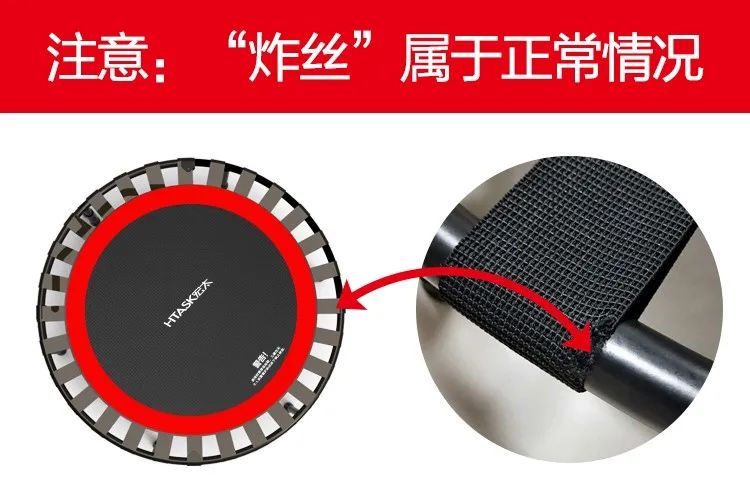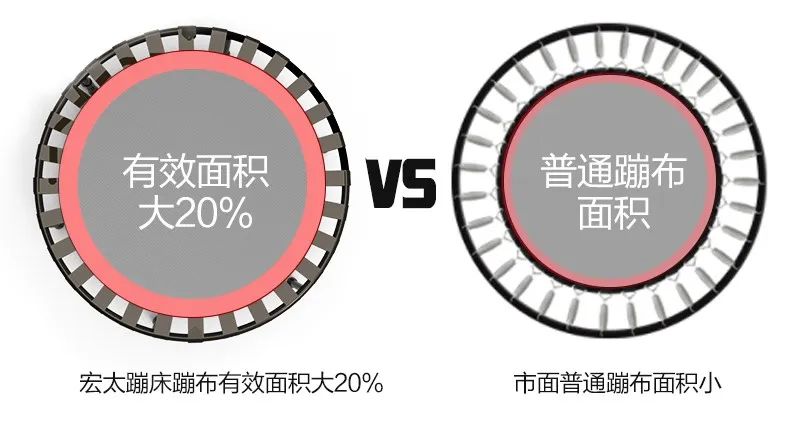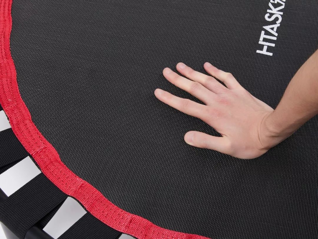 首先,传统蹦床靠弹簧钩提供弹力支持,弹簧钩边角很尖锐,容易割伤脚,弹跳时还会吱呀吱呀响,并不适合家用。而宏太这款小蹦床就做了改良设计,用高弹力织带提供弹力支持,不仅弹力出色,还更安全静音。