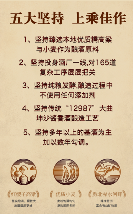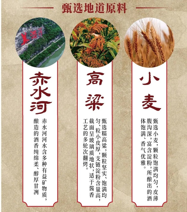 选用当地特产的红缨子糯高粱、优质小麦与赤水河水为原料,遵古法酿造工艺而成;从原料进厂到产品出厂,至少要经过3~5年~