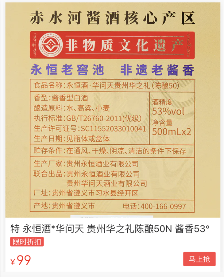 知名大厂,传承非遗酿酒工艺,与正宗华派酱香强强联手,口感好,自己喝或者送礼都不会出错!粉丝特惠:99元500ML2瓶/盒,289元3盒/件(一件6瓶)把贵州华之礼陈酿50【永恒酒·华问天】带回家!!!
