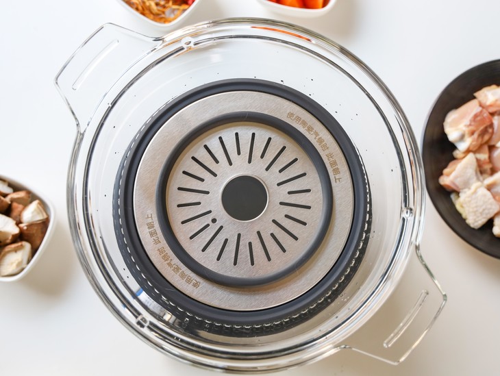 3.陶瓷汽锅盖上玻璃盖,然后整锅放置在玻璃煮锅的蒸盘上,注意将陶瓷汽锅底围骨对齐蒸盘中间硅胶圈;
