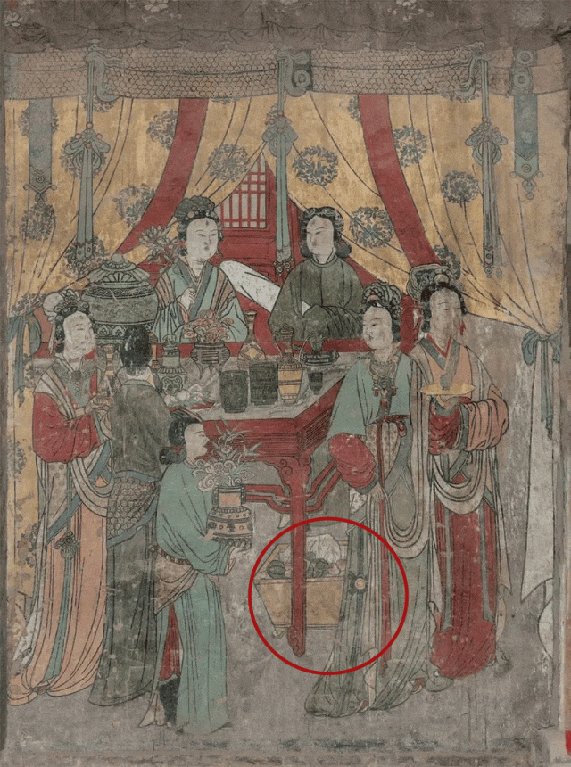 还有水神庙《尚宝图》,桌下木斗里用来冰镇和保鲜的白色冰块。
