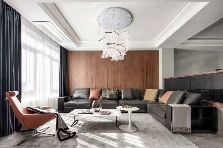 精致简约的设计之下投注着对质感的追求,带来的是整体的自然优雅。皮质组合沙发与大理石质感结合的茶几设计,彰显出实用优雅的时尚现代感。 一把橘色皮质休闲椅,成为空间亮点,室内外带着些许禅意的装饰元素,更加提升了空间主人的个性态度,舒缓温柔。让客厅充满现代简约的格调基础的同时,营造出轻松舒适的生活空间。