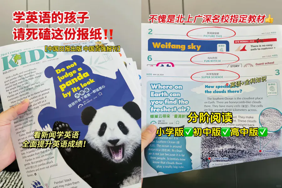 📕小学版的英语报,适合4年级以上读虽然是纯英文的,但是配图和选材的趣味性还是非常强的,看过的都是爱不释手;同时配有美籍原声音频+直播课,听力也能锻炼到📻
