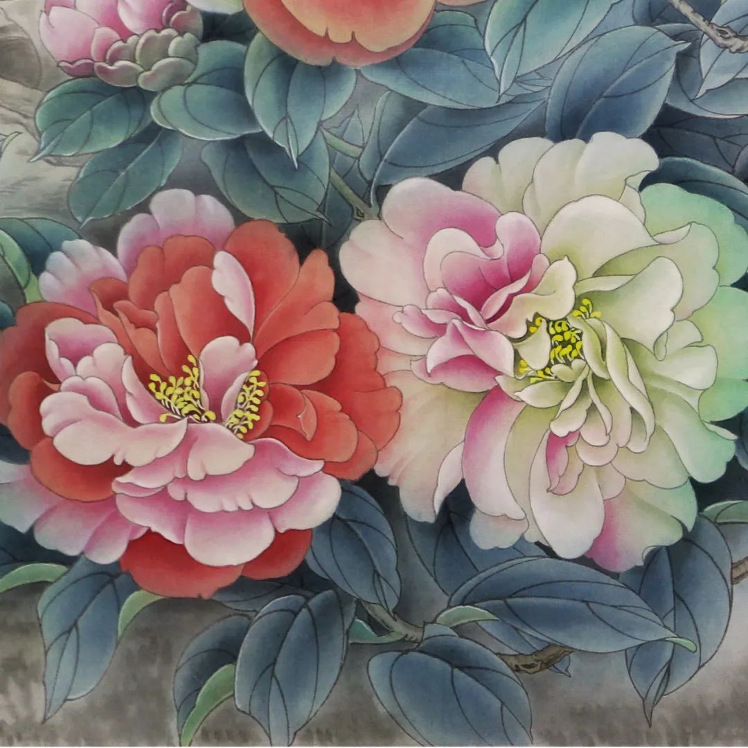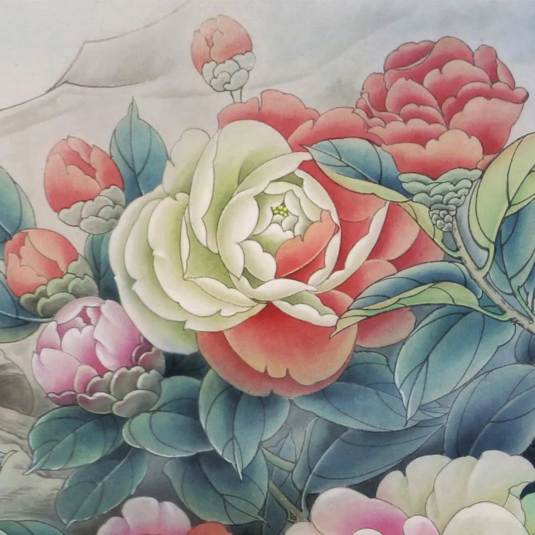 这一步要开始细细分染,红色花头用大红分染,粉色花头用牡丹红分染,白色花头用茶绿加土黄分染,反叶平涂草绿,正叶用花青分染。