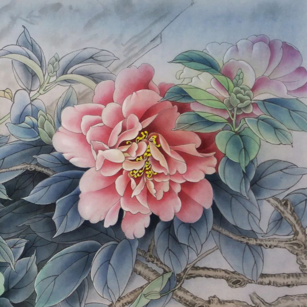 整理是最后的完成部分,要注意整个画面的协调性。叶子用花青墨加重暗部,花头用白粉提亮,用藤黄加白粉点花蕊,反叶用四绿倒染。