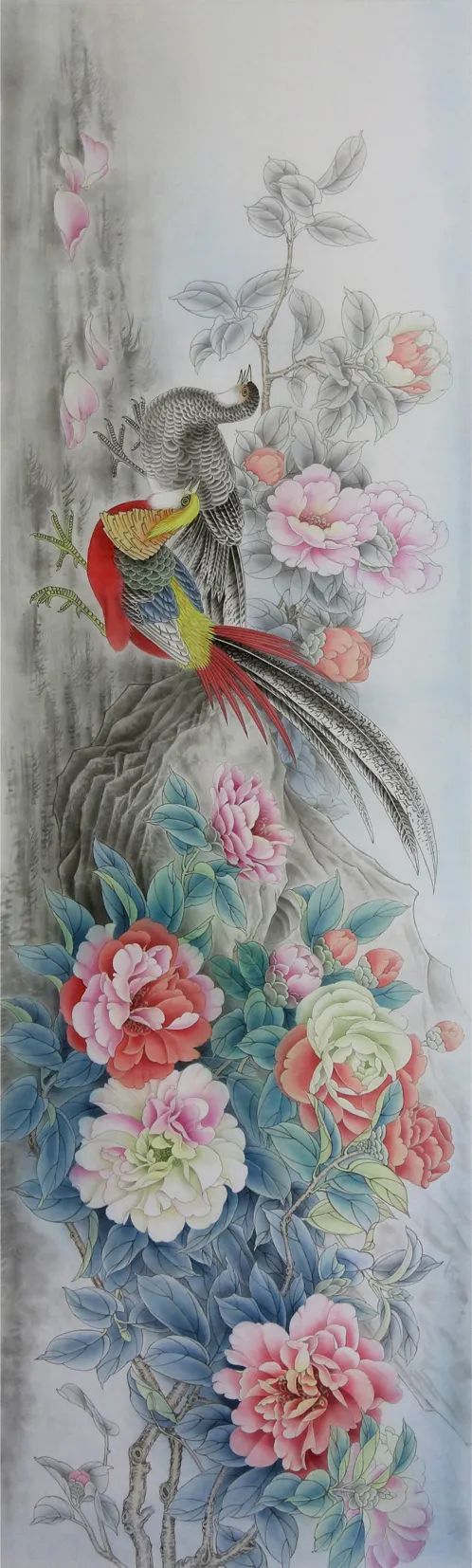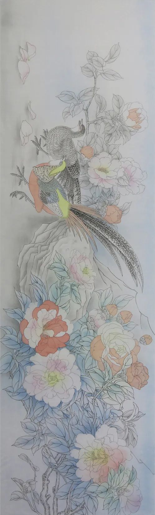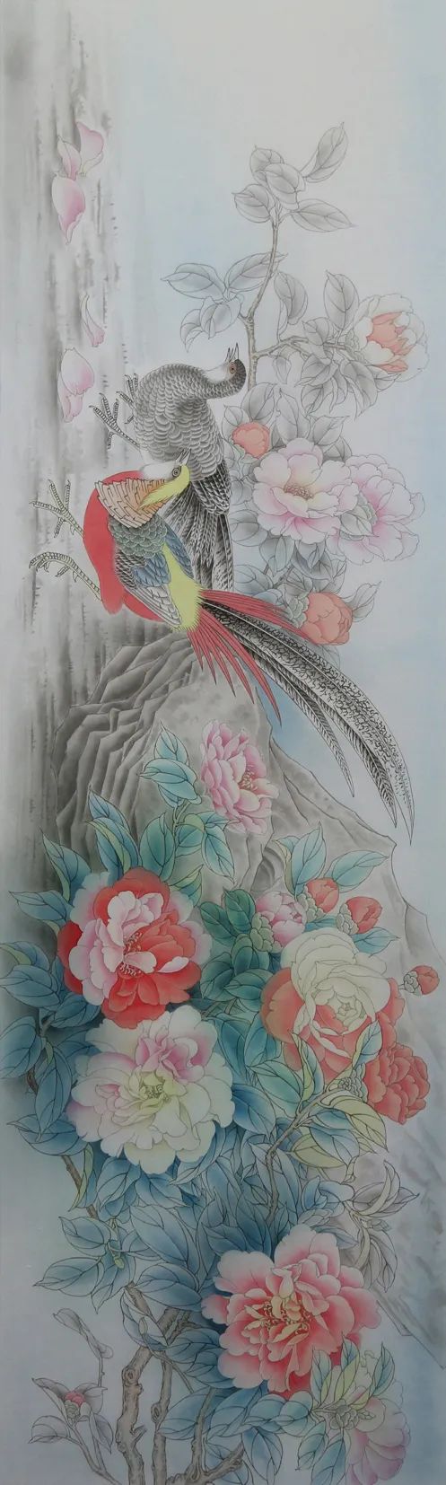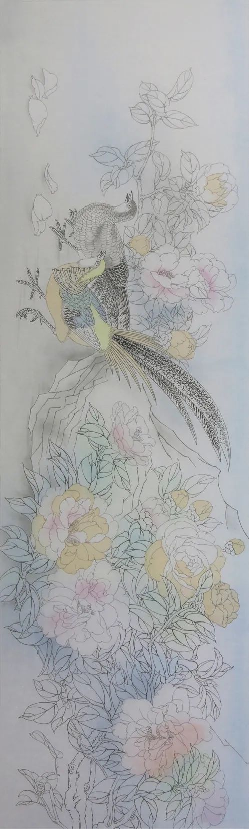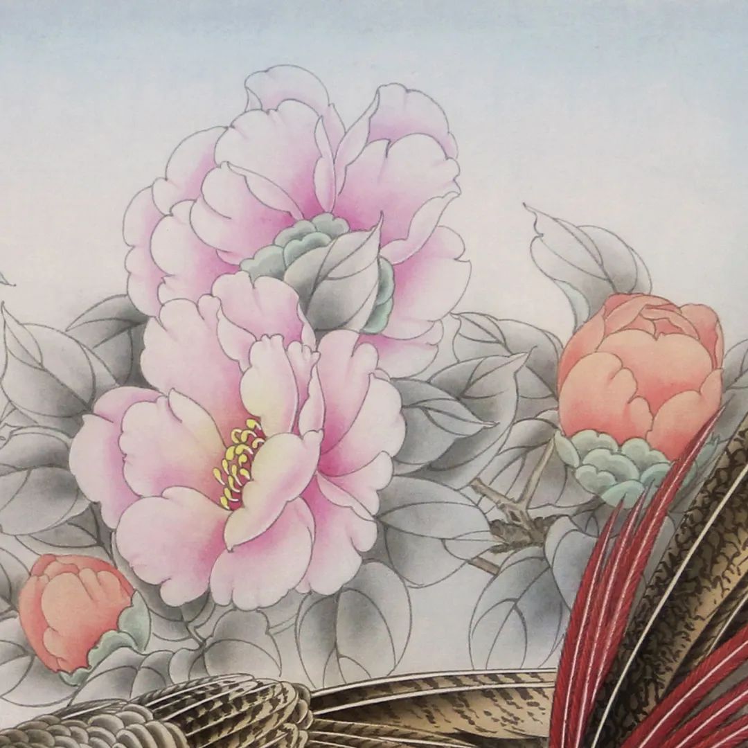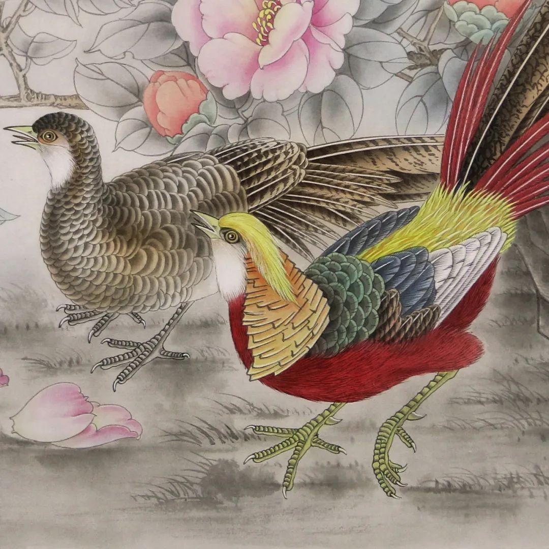 雌鸟用焦茶局部晕染,红腹锦鸡尾部用焦茶分染,浓白粉画羽骨,白粉丝白毛,腹部用大红加墨丝毛,点睛,提画细节,头部羽冠用藤黄加白丝毛。