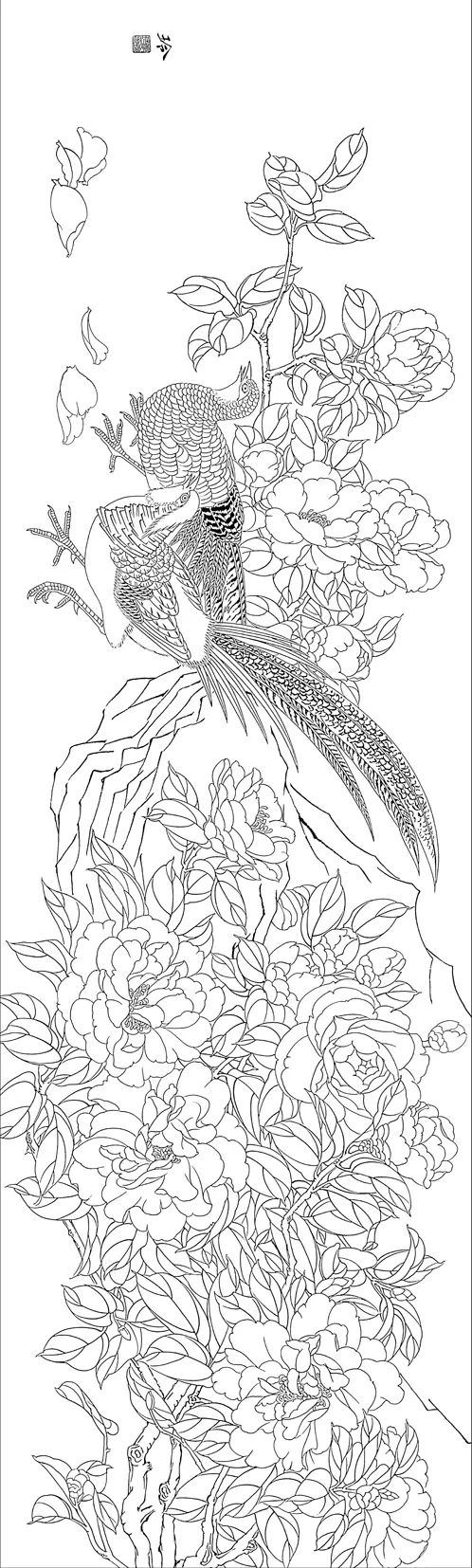 用重墨勾锦鸡尾部的羽毛、羽冠和嘴,中墨偏重墨勾爪子,淡墨勾眼、颈、胸、腹、翅。整体前景的物体都要比后景的物体墨色要重。(为方便观赏,此处用重墨印出。)