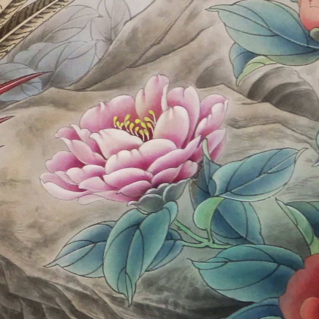 牡丹向来有富贵花之称,锦鸡中“鸡”是吉祥,吉利的象征。这幅《锦绣前程》绘牡丹、怪石及锦鸡于一体,扭首顾望富贵吉祥的牡丹,真实生动地描写了牡丹花大富贵和锦鸡的顾盼姿态。