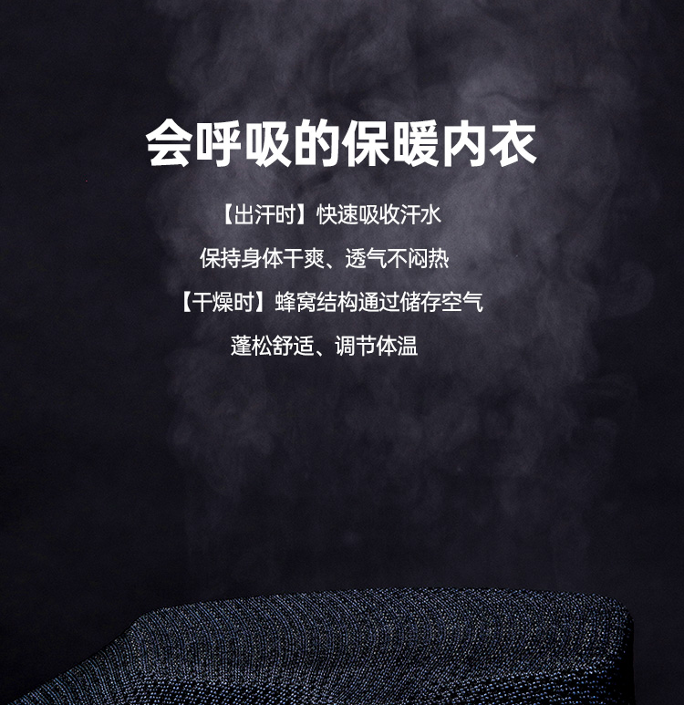 多种功能吸排纱线,科学配比而成,吸湿排汗,告别身体的粘腻,碳能纤维升温暖而不热,排汗快干不湿冷。