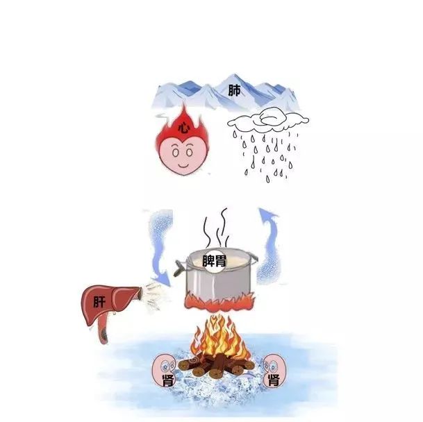 火加热锅里水和食物,水气就蒸腾起来,这个肺就像盖子,或者冷凝器,水蒸气上腾,为了维护水的循环,从肺这里降下去,输布到皮肤七窍,多余的水还会从膀胱排出去。