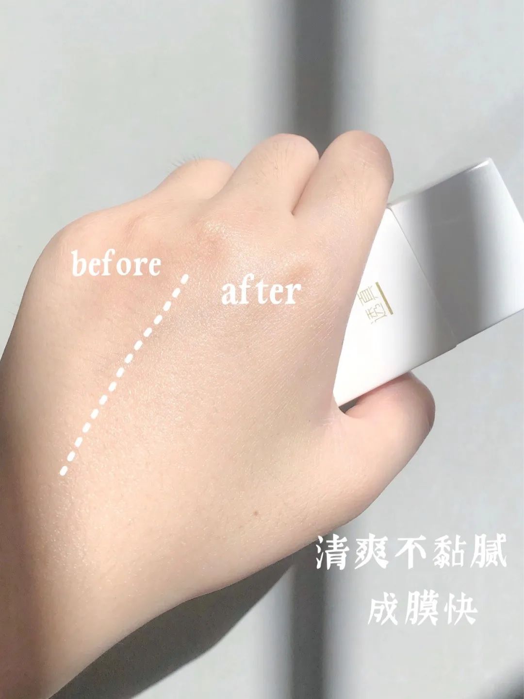 质地非常轻薄,抹好后成膜速度快,轻盈不闷痘的属性简直是今年防晒挑选的首要条件!