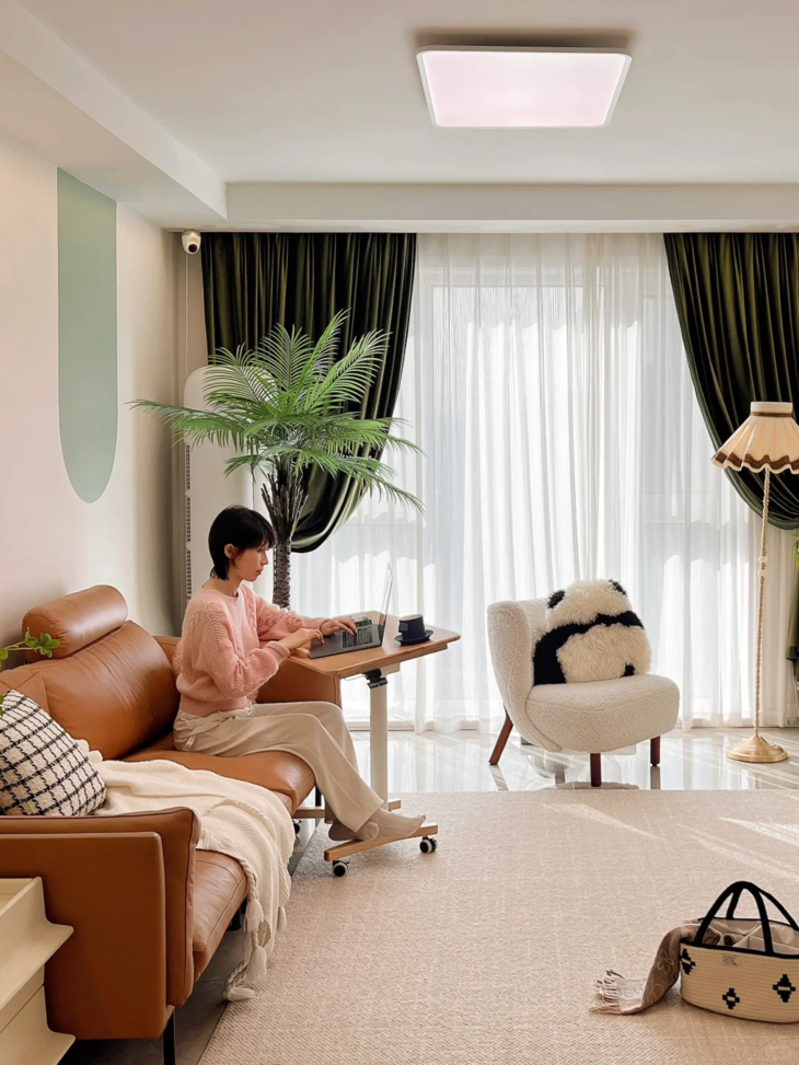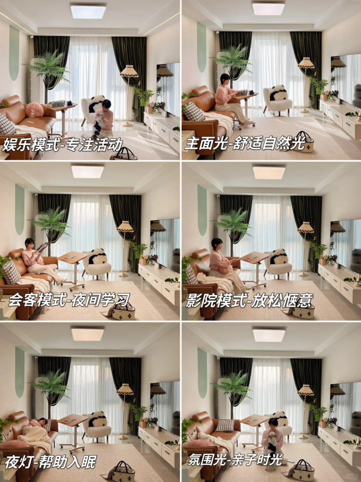 更方便的是,还有6种专业定制的灯光模式场景,白天时一键开启会客模式,光线明亮柔和🏮;晚上看电影就开启影院模式,氛围感慢慢;睡觉再打开夜灯模式,起夜不用怕磕碰,方便又省心