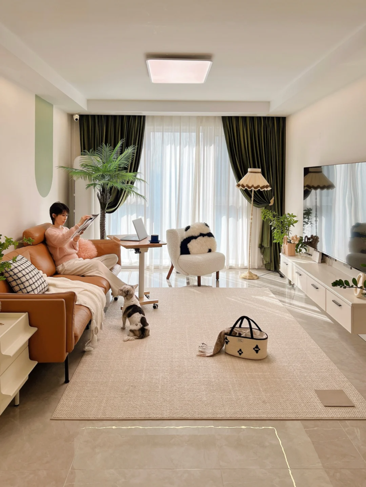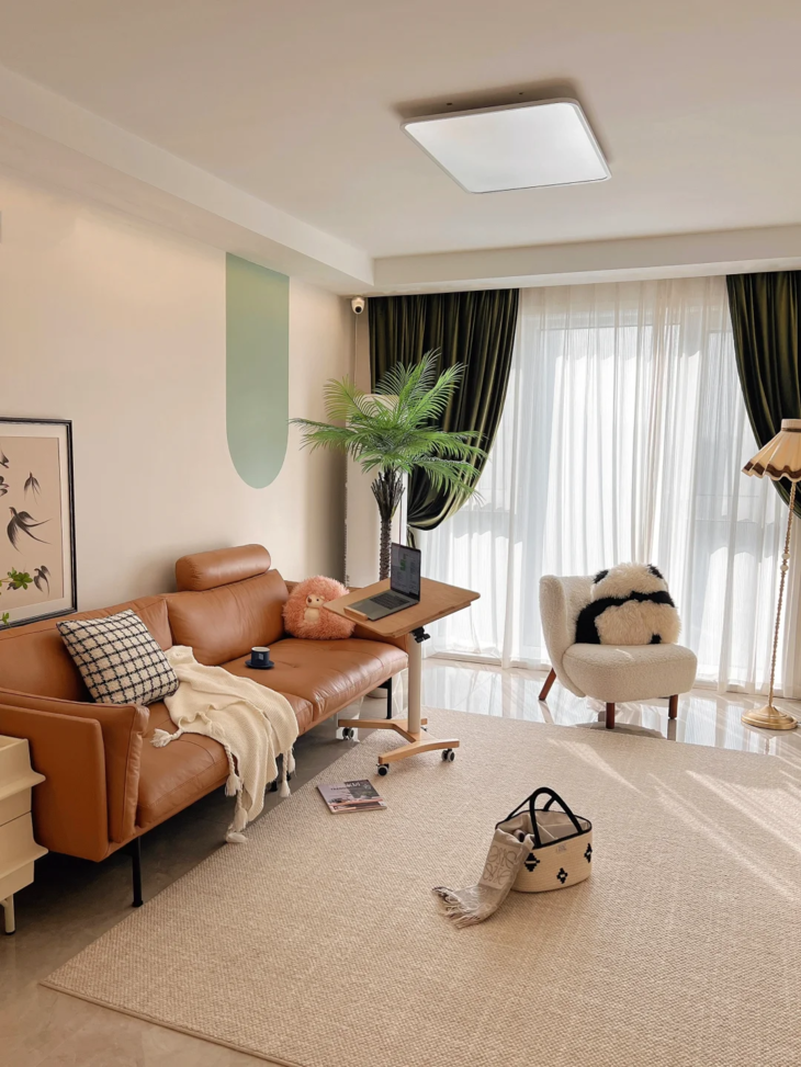 我家客厅层高2.6米,开间3.5米,沙发背景墙4.8米,虽然净面积还可以,但因为客厅没有阳台,再加上一个空调就占了半米🥲,所以总感觉客厅空间很局促,为了显大真的费尽心思