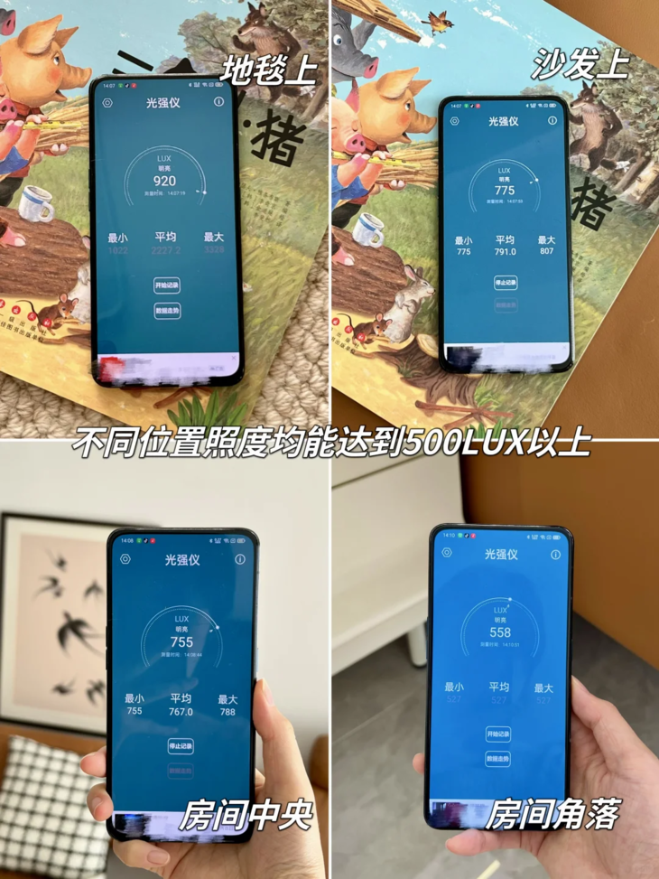 我专门用照度计测了一下不同空间的指数,结果照度都不低于550lux,这个指数就连幼儿园都能用👶,更别说家里的办公学习环境了,单凭这么高的标准就足以让我心动了