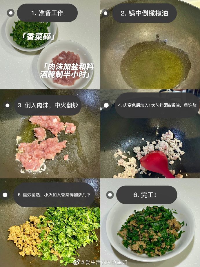 2. 香菜炒肉沫制作:香菜切碎,肉沫加料酒和盐腌制半小时 —> 油热加入肉沫,中小火翻炒 —> 肉变色加入1勺酱油、料酒、水和一些盐,炖煮1-2分钟 —> 水干开小火,加入香菜碎翻炒几下即可,见图3⃣️。