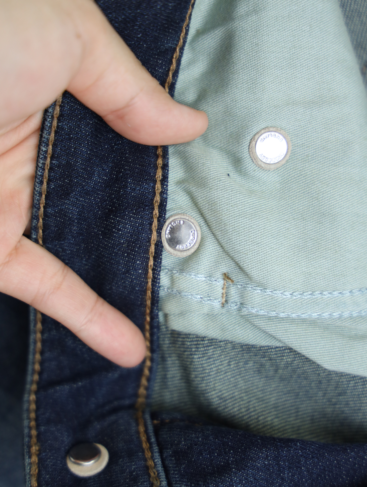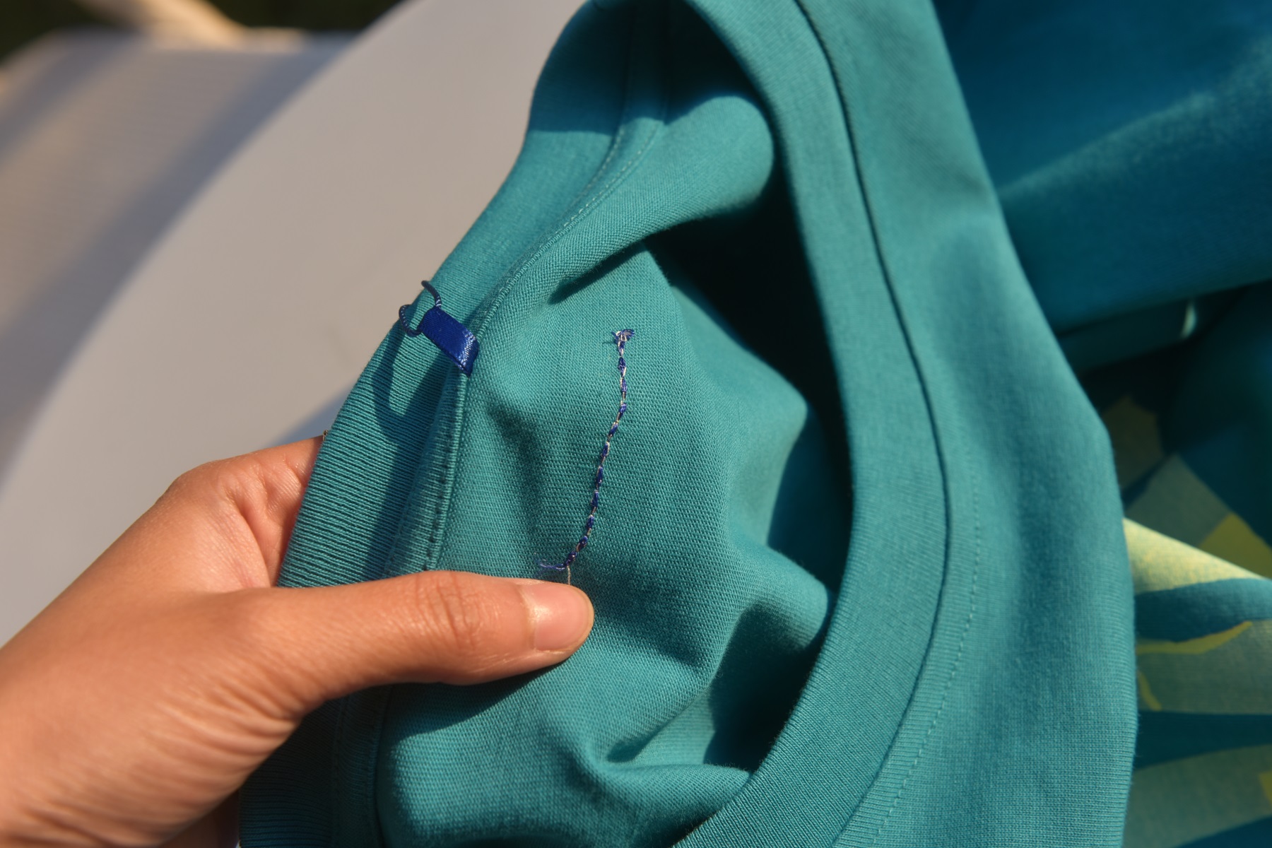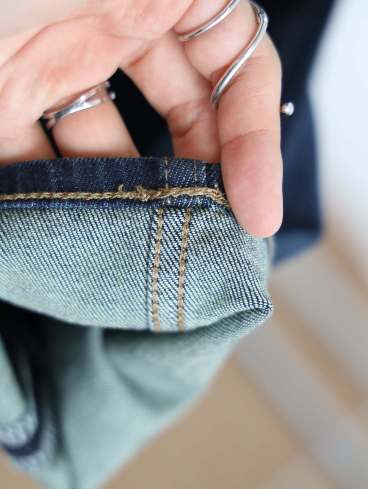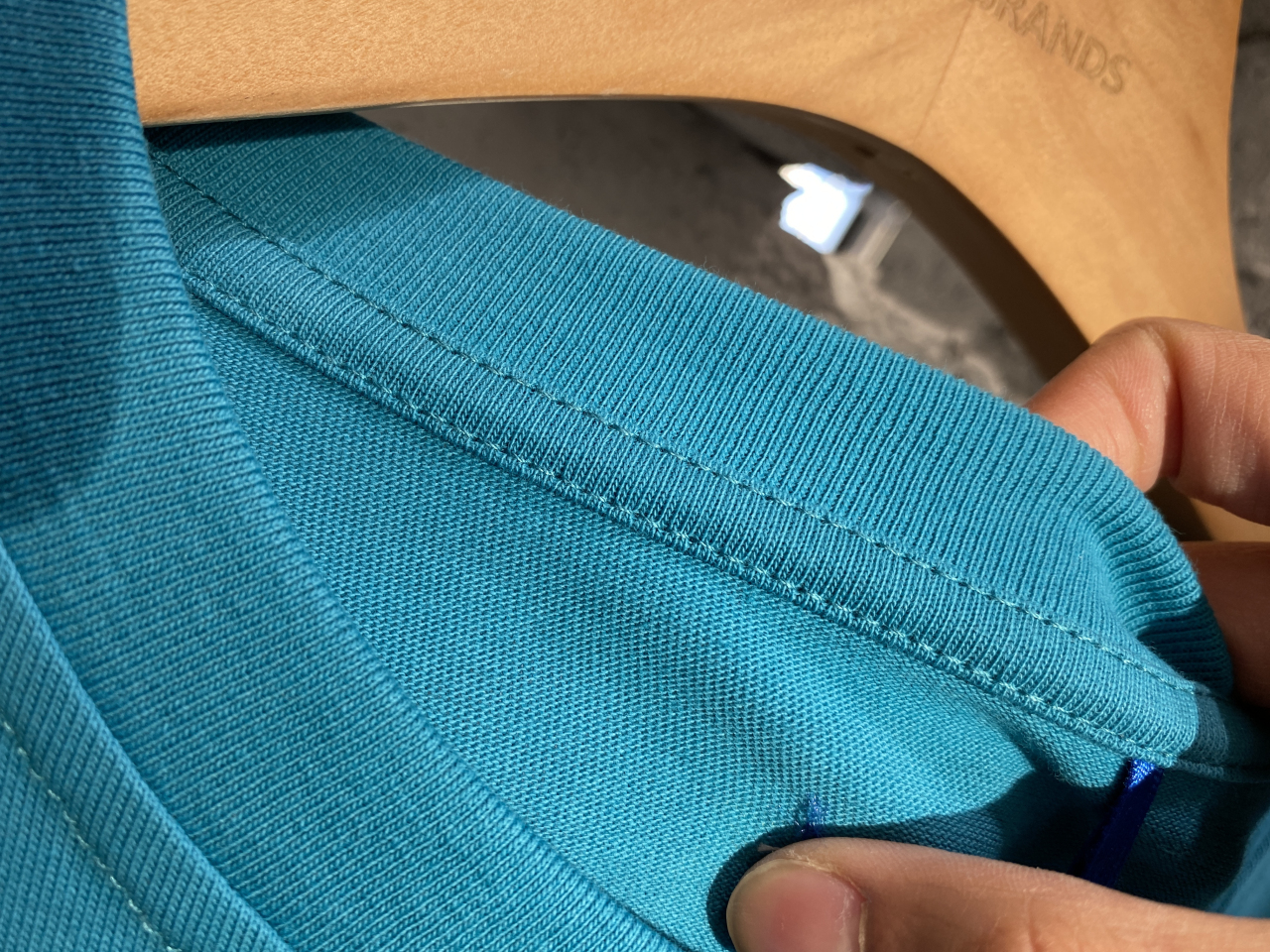 袖子和下摆的拼缝处是做了斜角的隐藏式针脚做法 正面只有一条线,背面则是复杂的立体拷边