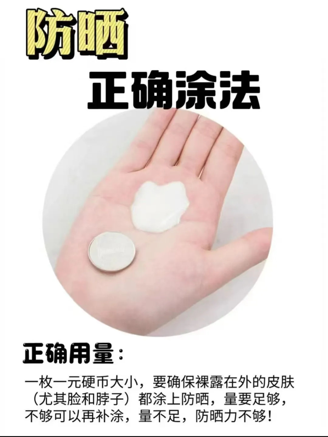 用量要足!别心疼!脸部的用量大约是一个一元硬币大小。脖子、耳朵、手背等暴露部位同样重要!涂少了等于没涂。