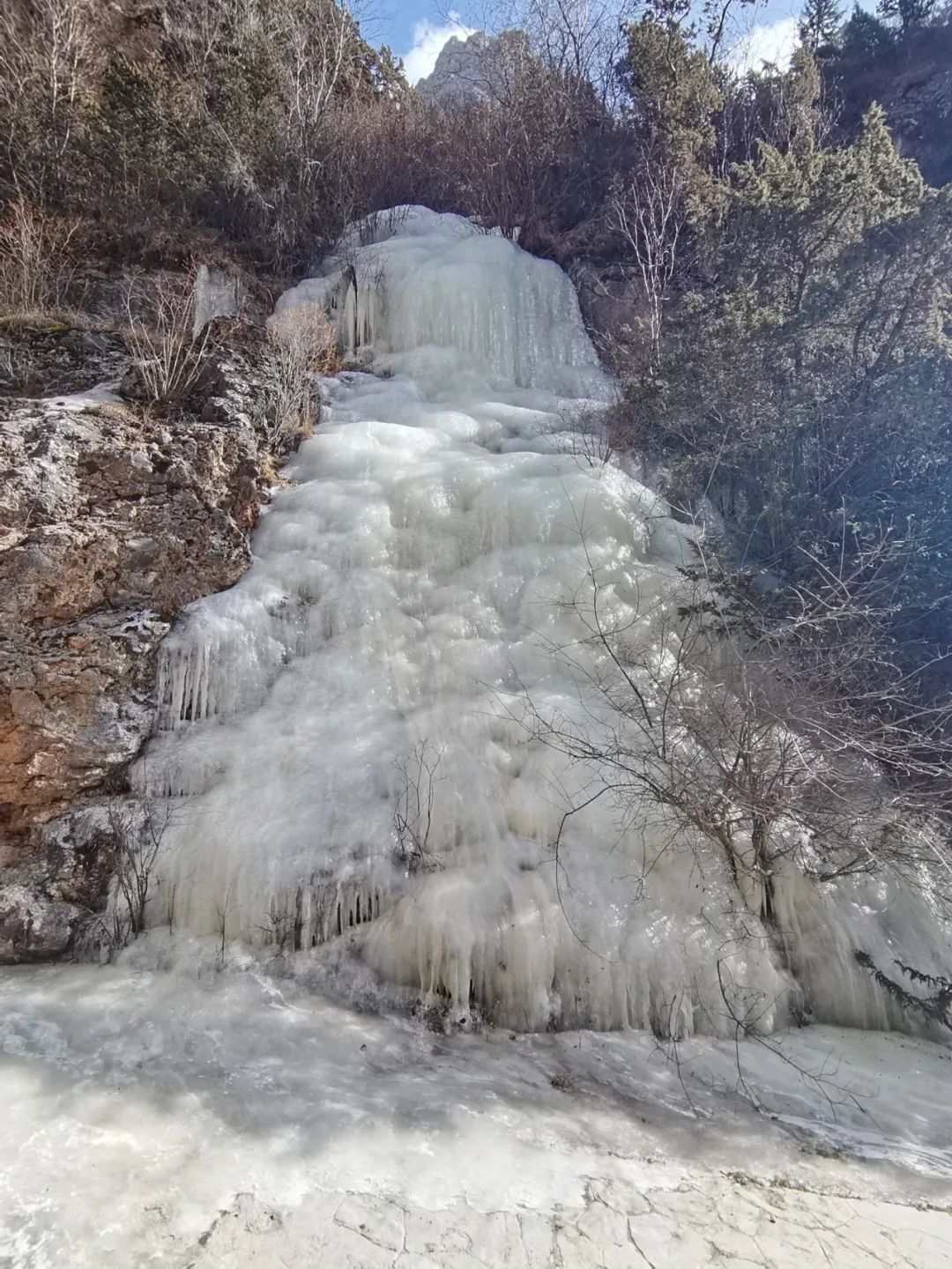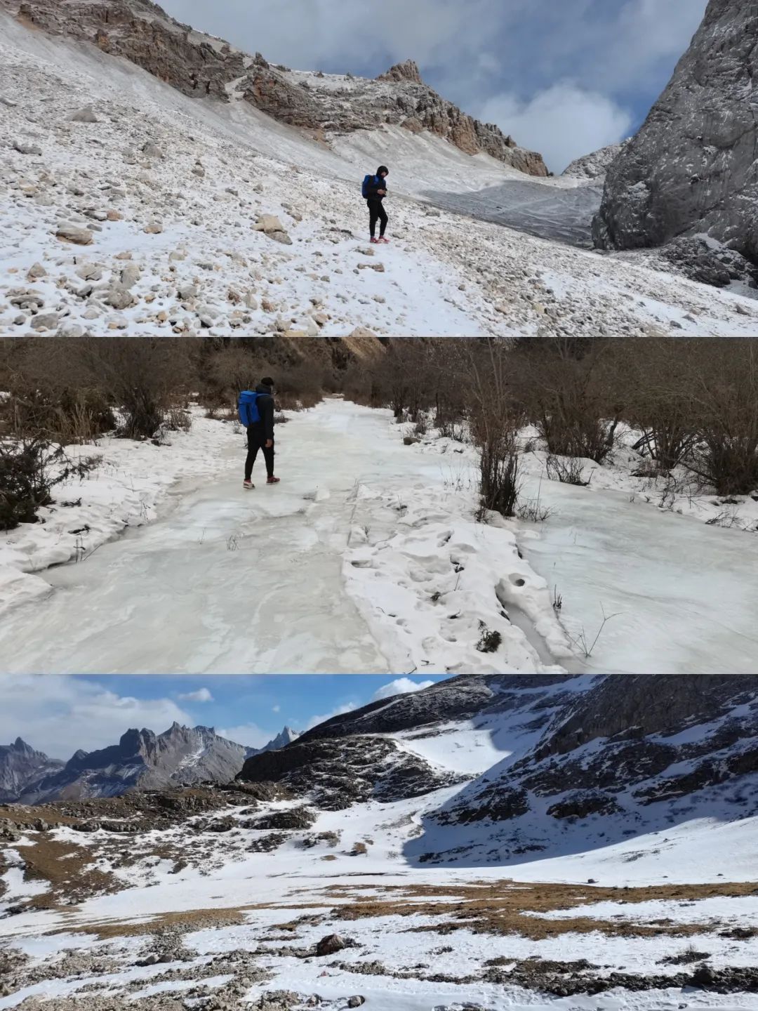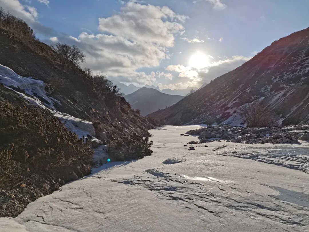 其实这个季节的山上并没有多少雪,除非遇上降温下大雪,白天天气非常的好,地上只有少量的积雪(除了冷,没有别的),大部分都是河流结冰路段,只要穿上冰爪,其实还是非常好走的。