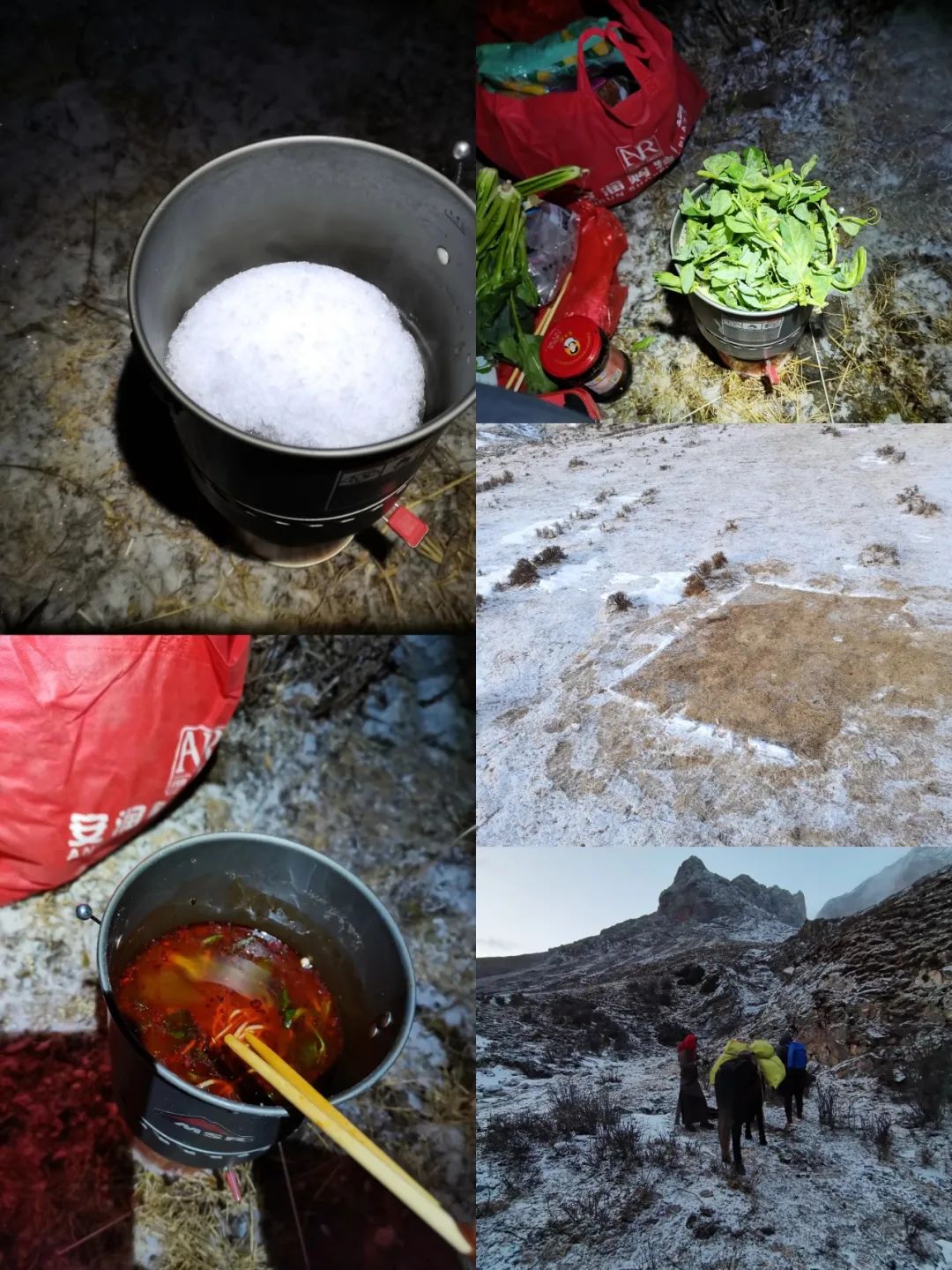 最终,当天下午我们徒步约 15 公里,我记录着沿途的轨迹/景色和海拔,大概记得今日翻越了 4 座海拔 3800-4000 米的小垭口,眼见天黑了,我们就在最后一个垭口-交布克垭口的下方扎营,冬日异常寒冷,地钉都打不上,我们就用石头压住帐篷,没有水源,只能化雪烧水,晚上也是将就着吃点泡面,比较幸运的是我们自带了青菜。