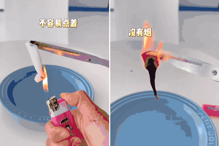 👉左边:混纺材料,燃烧不完全,味道刺鼻;