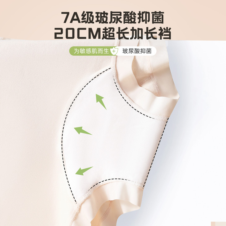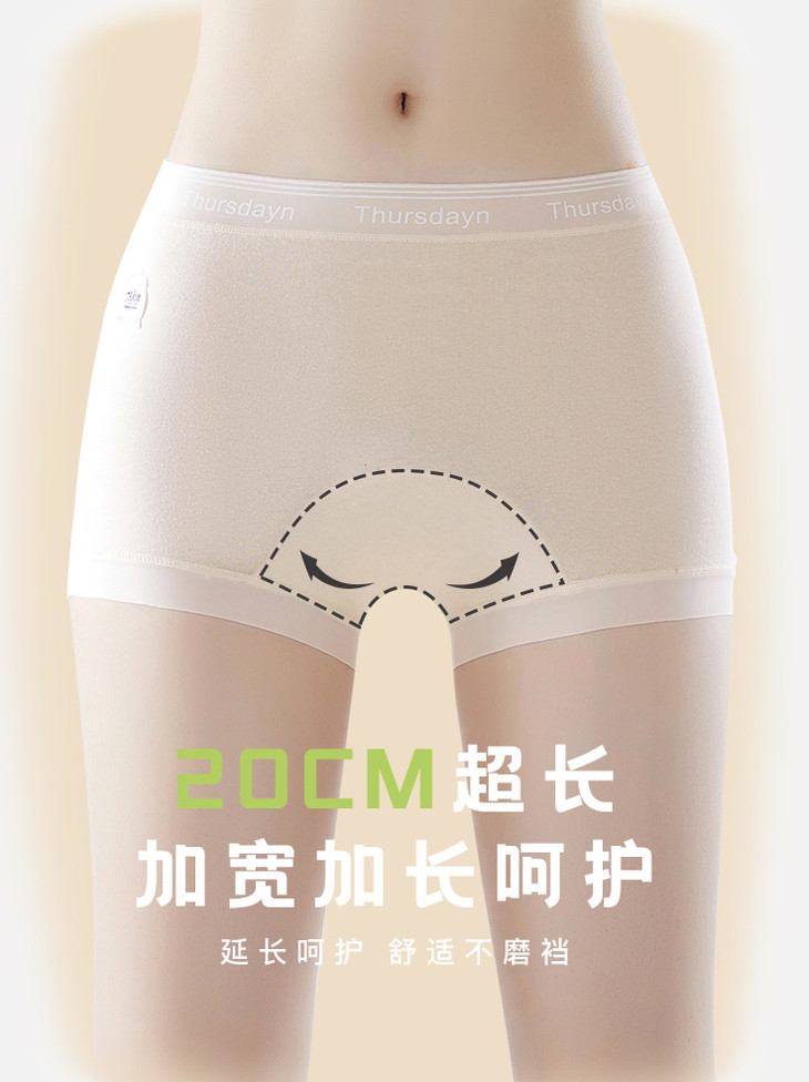 加宽平角版型,20CM超长超宽底裆,全方位包裹,肉肉多的姐妹也不用担心夹臀、磨腿。