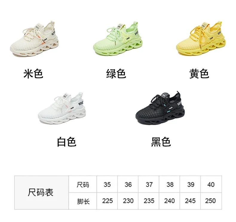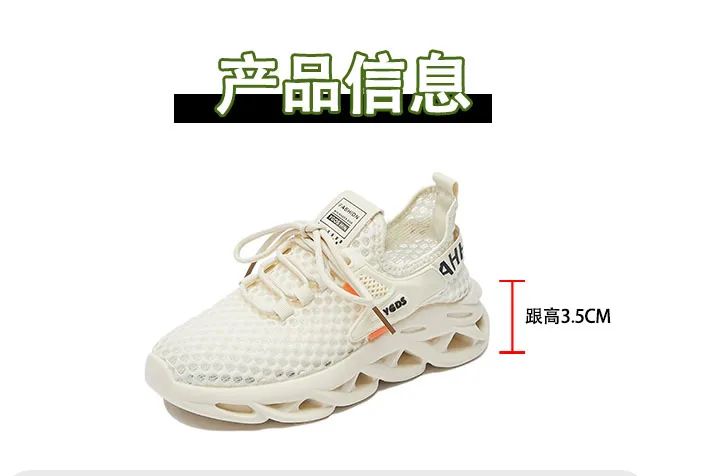 透气鞋面+微孔泡棉鞋垫+大网孔透气网布+中底开槽气流通道。