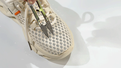 飞织工艺耐磨耐穿,同事用剪刀咔咔咔给大家展示!