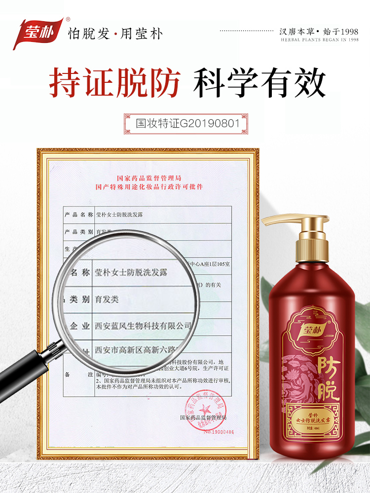 这款女士专用防脱洗发水经过了国妆特字认证,并拥有,陕西中医药大学医院的临床试验报告证明防脱有效率在90%!一个资质的审核一般需要3~5年!