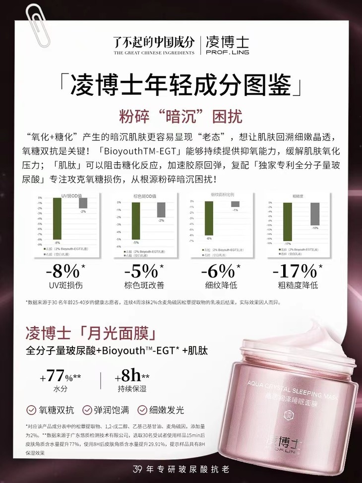 凌博士月光面膜中添加2%麦角硫因,全分子量玻尿酸及多重焕亮成分,氧、糖双倍对抗,远离暗沉、糙黄,轻松get通透发光肌~