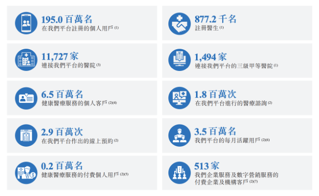 从平台注册医生数目,在中国数字健康医疗服务平台,排名第一; 从服务个人客户数量,在中国数字健康医疗服务平台,排名第一; 从平台连接的一级/二级/三级医院数量,在中国数字健康医疗服务平台,排名第三; 从平台注册的个人用户数量,在中国数字健康医疗服务平台,排名第四。