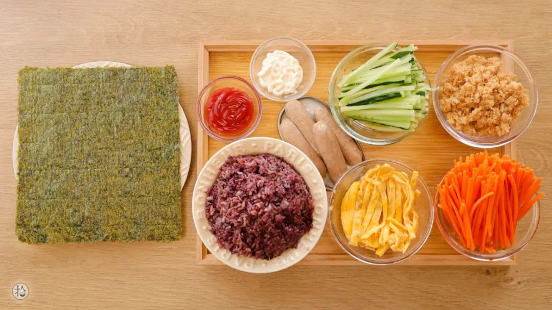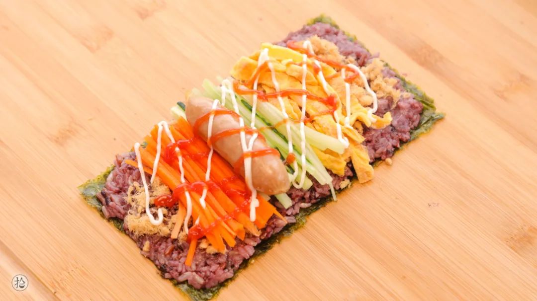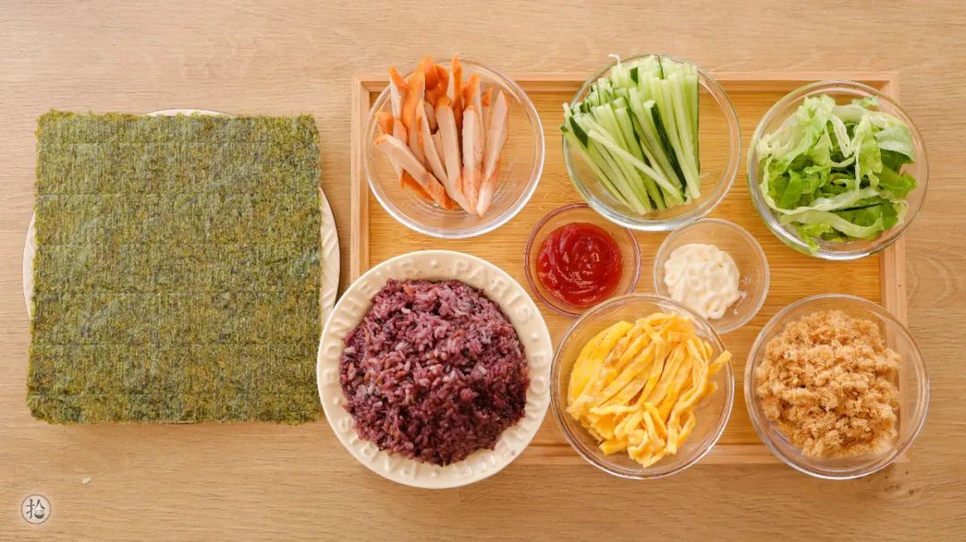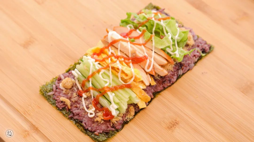馅料2:紫米饭/适量、寿司海苔/适量、青瓜丝/100g、鸡蛋丝/适量、鸡扒/适量(切小条)、肉松/适量、生菜丝/适量、沙拉酱、番茄酱/适量