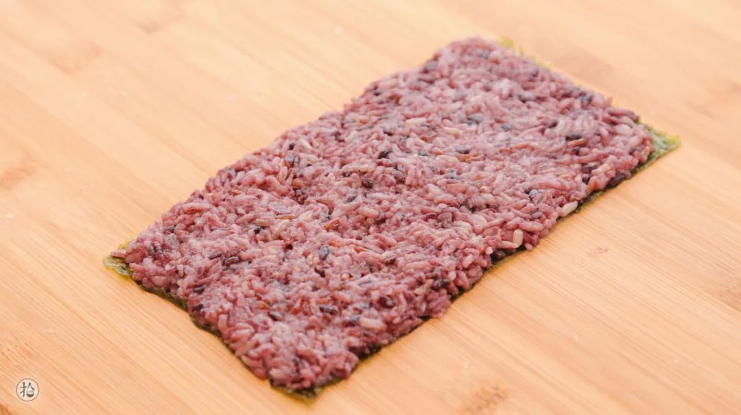 2.戴上一次性手套,取约100g的紫米饭,用手掌推开。