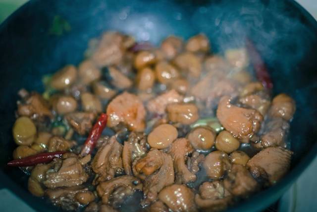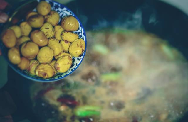 6、倒入板栗,盖上盖,继续煮15分钟左右,汤汁收浓,出锅!