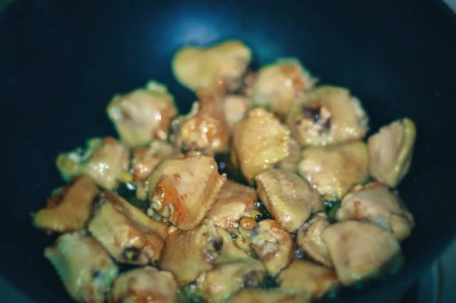 2、接着倒入鸡翅,改中火,不停翻炒,鸡翅上色,略微收点水,大约2分钟;