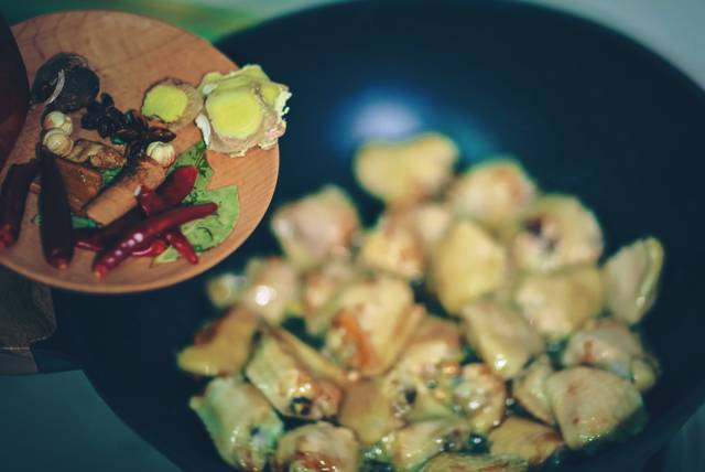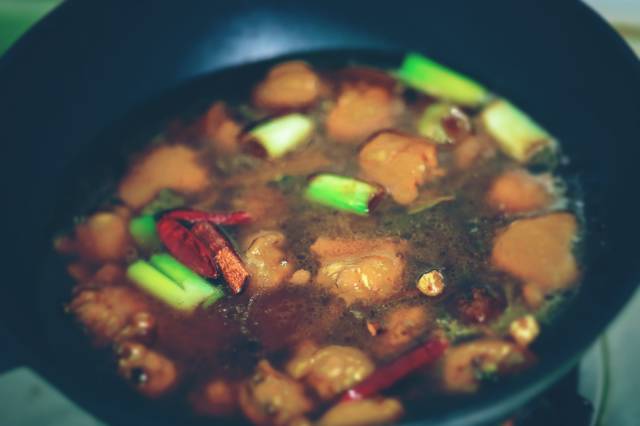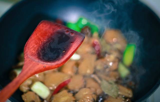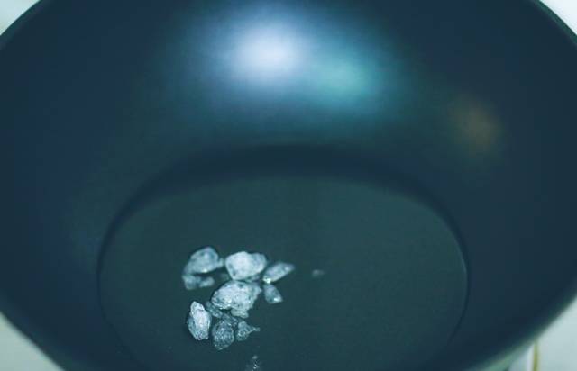 1、热锅凉油,用小火,放入冰糖,不停翻动,直至冰糖全部化开,变成红糖的颜色;