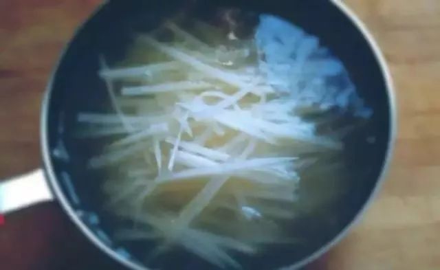 4、白萝卜收拾一下擦成丝,稍微加点盐拌一下,让萝卜下汤,做开一锅水,萝卜下锅煮一下,过凉挤干水备用;