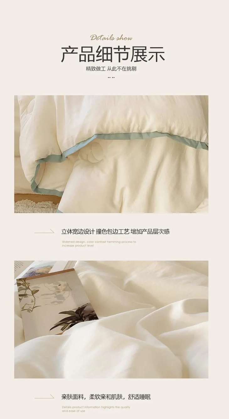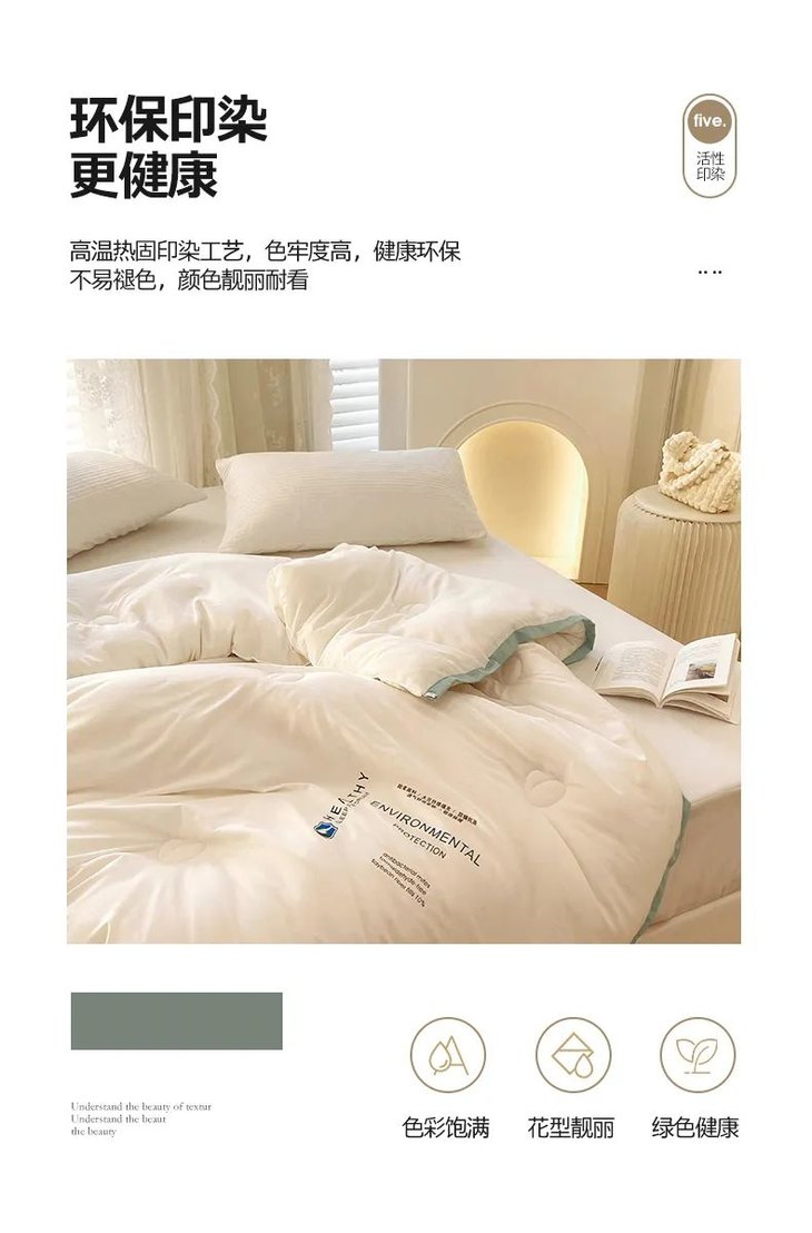 被芯以大豆复合纤维整张纤维填充,越睡越柔软,同时也避免了在睡觉的过程中成坨、结团。