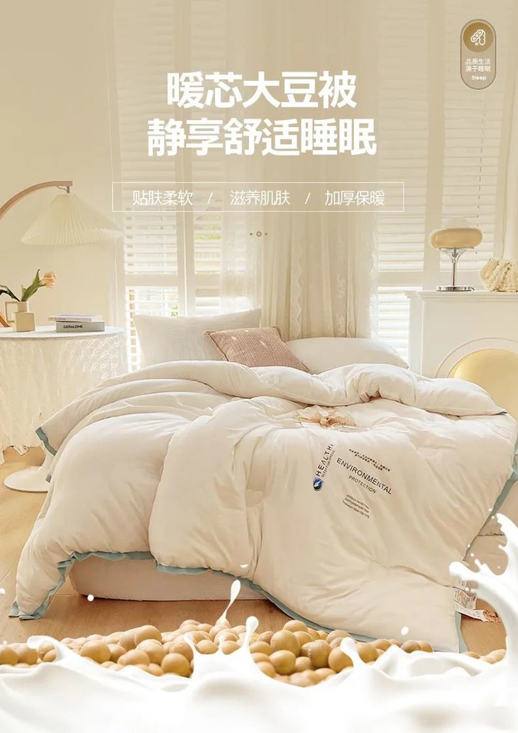 大豆被以大豆豆粕为原料,提取球蛋白,保暖性和透气性良好,越睡越蓬松。黄金配比,柔软力提升的同时,更蓬松柔软,同时也不易变形和板结。